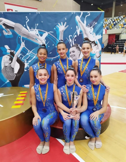 El conjunto infantil absoluto del Club 90 lo forman Lola Viñuales, Alexandra Sanagustín, Alicia Lizáldez, Shannea Marco, Lucía Malo y Alba Fernández, que vienen a denominarse el "Team Mediterráneo" para realizar un montaje de tres aros y cuatro mazas. "Hay una primera parte con cantos de sirena, las olas del mar y finalmente, de forma instrumental, la canción de Serrat", comenta Cristina Perea, que ve "mucha ilusión y ganas" en las jóvenes gimnastas. "Han trabajado muy bien en una temporada que, desde que empezó en el mes de enero, se ha hecho muy larga".