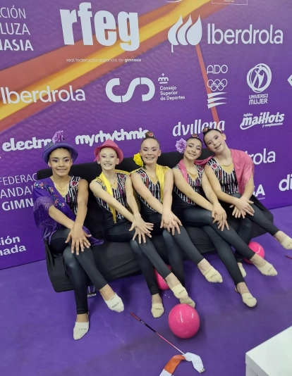 El último en saltar al tapiz fue el conjunto Infantil absoluto con un ejercicio de dos cintas y tres pelotas. Hicieron un buen entero hasta el final, que fue cuando cometieron un fallo que les relegó a una excelente sexta posición cuando podían haber estado cerca del podio. "Este resultado es una inyección de energía y motivación porque, salvo ese fallo, lo hicieron muy bien. Van a seguir mejorando con este ejercicio de cara al Campeonato de España de diciembre y el sábado está el clasificatorio pensando en la segunda fase de la Copa de España en junio", apunta Cristina Perea. El conjunto, que está en las aulas de Tecnificación del IES Pirámide, lo forman Aitana Cabezas, Naya García, Aranzazu Muñoz, Vera Barnes y Daniela Mendoza.