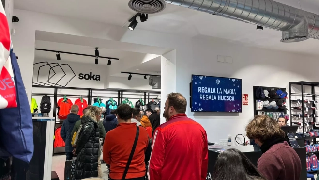 La afición azulgrana no ha tardado en formar una cola en las oficinas durante toda la tarde, y es que una treintena de personas han esperado para obtener sus entradas en el interior de la tienda del Huesca, sita en el Coso Bajo.
