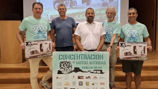 Esta mañana se ha presentado en rueda de prensa la XX Concentración de Motos Antiguas de Alberuela de Tubo, acto que ha tenido lugar en el Salón de Actos de la Comarca de Los Monegros con la participación del presidente de la Comarca de Los Monegros, Pedro Loscertales, el concejal del Ayuntamiento de Alberuela de Tubo, Abel Lambea, Luis Peralta, Antonio Puyol y David Gabarre, presidente, secretario y representante, respectivamente, de la asociación “El Puntal", organizadora del evento