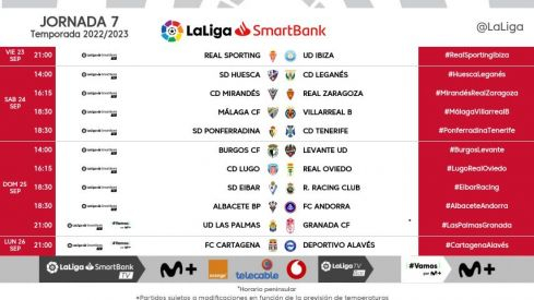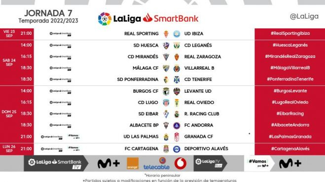 Este jueves se han anunciado los horarios de la jornada 7 en la Liga Smartbank. La SD Huesca jugará su primer partido en sábado de la temporada ante el CD Leganés. Será el día 24 de septiembre a las 14'00 horas.