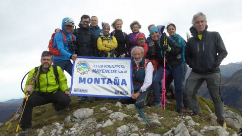 Con principio y final en La Mina, bello paraje de la Selva de Oza, los catorce integrantes del grupo tomaban la ruta ascendente del Camino de Santiago (GR 65.3.3), dejándolo justo antes de cruzar el barranco, punto por el que se volvería, cerrando la circular. Se cruzaba el barranco para seguir en dirección al ibón de l'Acherito, hasta dejarla y continuar valle arriba, con buena presencia de grupos de sarrios, para encaramarnos al cordal en el collado de Lariste, desde el que se obtenían ya buenas vistas sobre la vertiente norte, con el telón de fondo de muchas de las montañas pirenaicas. El fuerte viento reinante, se acentuaba a la llegada a la divisoria.