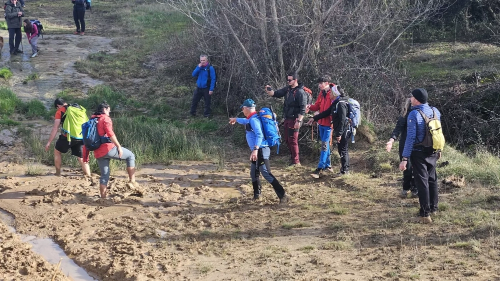 Seguían por pistas hasta Sipán, de ahí a Loscertales y Coscullano, para desembocar en Aguas, todo por caminos con muchísimo fango, vadeando con mucha paciencia charcos. Comida en Aguas, en la plaza junto al Club Social. Reemprendieron la senda hacia Panzano, donde alguno hubo de dejar las botas y las zapatillas porque el barro semejaba una especie de arenas movedizas succionadoras e inhabilitantes.