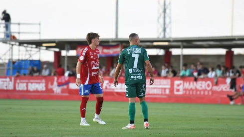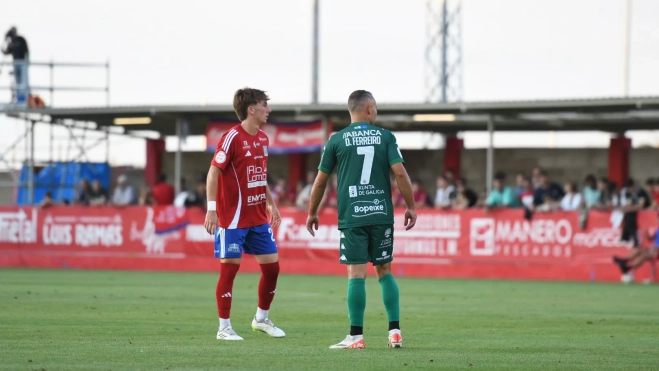 Manu Rico, jugador de la SD Huesca cedido en la SD Tarazona, debutó con el equipo turiasonense este domingo en Primera RFEF. Lo hizo con un gran triunfo (2-1) sobre el Arenteiro, equipo en el que actualmente milita el exazulgrana David Ferreiro. Ambos coincidieron sobre el césped y de ahí la fotografía que captó El Marcador Aragonés.