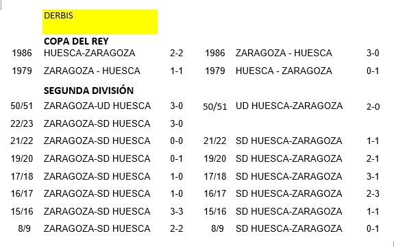 A lo largo de la historia (ver cuadro adjunto) se han producido bastantes enfrentamientos entre el Real Zaragoza y la Sociedad Deportiva Huesca desde que en 1950 los dos equipos coincidieran en Segunda División. El camino posterior fue diametralmente opuesto porque la Unión Deportiva Huesca desapareció en 1957 y tuvo que purgar tres años en el destierro antes de reaparecer en 1960 como Sociedad Deportiva y emprender un largo camino desde Regional hasta alcanzar en dos ocasiones el techo de la Primera División.