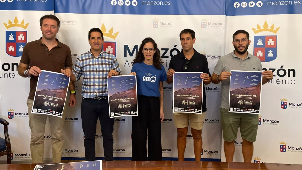 El concejal de Deportes, Eliseo Martín, los impulsores del Desafío, José Ramón Villa, Sergio Batista e Israel Tena, y la terapeuta de la Asociación AMO (Asociación Autismo Zona Oriental de Huesca y Otros Trastornos), Naiara Hernández, han presentado este miércoles en el Ayuntamiento el V Desafío Solidario Monzón 3404, que arrancará el día 5 de septiembre, a las 19:00h, desde el Conservatorio a favor de AMO.