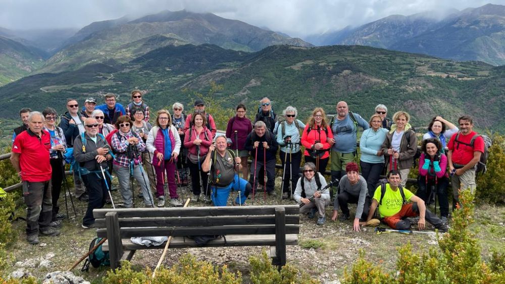 Volvemos sobre nuestros pasos hasta el cruce anterior y ahora seguimos la pista que nos lleva hasta la última ermita del día, la de Santa Lucía, también hay allí un mirador con el Macizo del Turbón de fondo, nos caen algunas gotas de lluvia así que no perdemos tiempo y reanudamos la marcha, la lluvia cesa y aprovechamos para visitar la “Piedra de las Nueve Cadollas” famosa por sus leyendas de hadas y brujas. A continuación seguimos la marchas por una senda que en ligero descenso, nos lleva hasta el aparcamiento en el Alto de Bonansa donde nos espera el autobús, algunos se dirigen por un camino adaptado, al mirador del Isábena, son cerca de las 14:00 horas, nos estamos cambiando de ropa y calcero, cuando de repente nos cae un buen chaparrón que nos hace subir rápidamente al bus, iniciamos el viaje de regreso, enseguida deja de llover, en menos de media hora llegamos al restaurante “La Cuadreta” en Obarra, donde tenemos reservada la comida, mientras nos preparan las mesas tomamos un refrigerio, acto seguido Javier, el propietario, nos indica que pasemos al comedor donde disfrutamos de una excelente comida, servida con gran amabilidad y profesionalidad por Javier y su familia, desde luego un lugar totalmente recomendable, nosotros volveremos. Acabada la comida nos despedimos de nuestros anfitriones y son las 17:00 horas cuando nos subimos al autobús para regresar a casa.