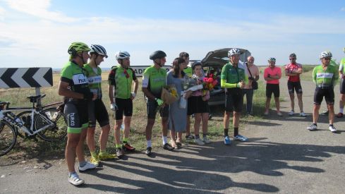 En total fueron unos 50 ciclistas, amigos y conocidos, los que completaron una salida en bicicleta desde Huesca, pasando por Sesa hasta el cruce de la cuadrada, en el pueblo de Fertusa. Allí arroparon a su viuda Maribel, quien recibió un ramo de flores, muy agradecida durante toda la jornada por este emotivo acto en recuerdo de Roig.