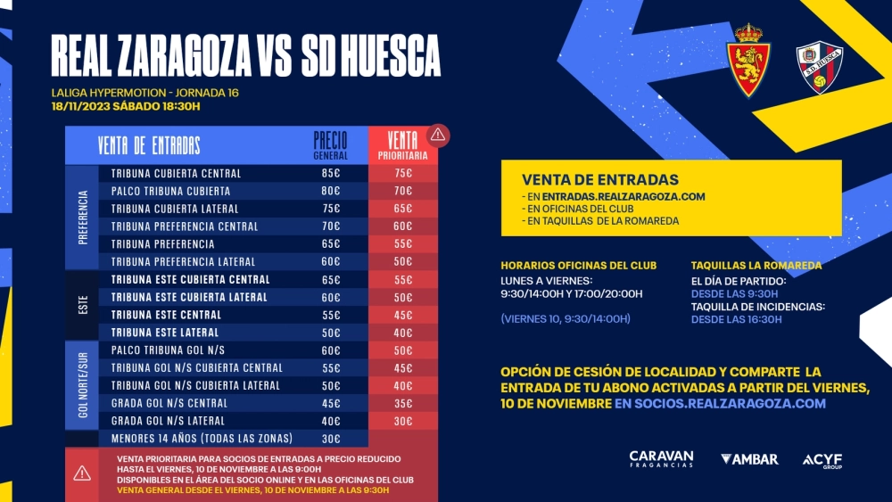 El Real Zaragoza ya ha puesto a la venta las entradas para el partido de la jornada 16 de LaLiga Hypermotion frente a la SD Huesca en La Romareda (sábado 18 de noviembre a las 18:30 horas).