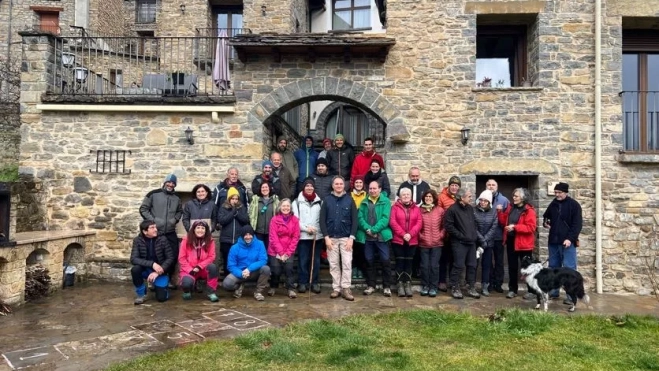 El día amanece más nublado de lo previsto en la jornada anterior. Pero en torno a las 8:30 44 personas nos reunimos en cuatro puntos de encuentro diferentes del Valle del Ara -es lo que exige la dispersión de la población de Sobrarbe- con el objetivo de confluir en la localidad de Bergua y desde allí subir a Escartín, en el Sobrepuerto, para conocer la arquitectura tradicional pirenaica en sus calles y construcciones, que vieron marchar definitivamente a sus pobladores a finales de los años 60. El Club de Montaña Nabaín organiza esta ruta, senderista y cultural, que interpretará uno de sus integrantes, el arquitecto boltañés, especializado en la arquitectura tradicional de Sobrarbe, Thibault Dieste.