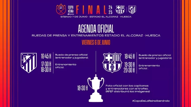 En cuanto finalicen su sesión de trabajo, y no más tarde de las 18:30 horas, se producirá una de las imágenes más esperadas del campeonato. Los técnicos y capitanas de ambos clubes posarán junto al trofeo de la Copa de la Reina Iberdrola en El Alcoraz, una imagen que la RFEF distribuirá a todos los medios una vez se haya producido.