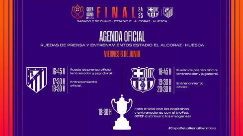 En la previa a la final habrá hasta cuatro retransmisiones en directo para no perder detalle de la actualidad de ambos conjuntos. Por tanto, el viernes 6 de junio comenzará el conjunto que actúa de visitante con la previa de partido por el título. A las 16:45 horas, Víctor Martín, entrenador del Atlético de Madrid, atenderá a los medios de comunicación junto a una de sus jugadoras. A las 17:30 horas comenzará el entrenamiento de las colchoneras y se ofrecerán los primeros quince minutos en abierto.