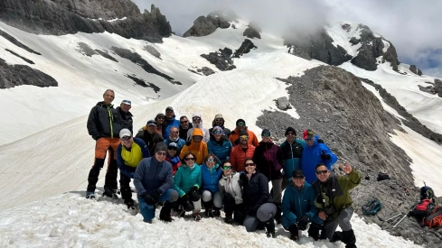 Desde allí continuamos con la excursión en dirección al pico Marboré. 200 metros por encima del refugio tocó sacar piolet y crampones, todavía queda mucha nieve en altura. Debido al buen estado de la nieve se decidió atacar el Monte Perdido y cuando nos quisimos dar cuenta ya estábamos en los últimos metros de la famosa “escupidera”. Y así nos plantamos todos los participantes en la tercera cima más alta de los Pirineos a 3.355 metros, aunque desafortunadamente las nubes y el fuerte aire no nos permitieron disfrutar de este magnífico momento. Una larga parada en el ibón Chelau para reponer fuerzas y una bonita tarde en el refugio contando anécdotas y experiencias de lo sucedido en el día.