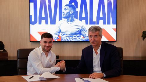 Javi Galán se da la mano con Miguel Ángel Gil Marín en la firma del contrato como nuevo jugador del Atlético de Madrid. Foto: Atlético de Madrid