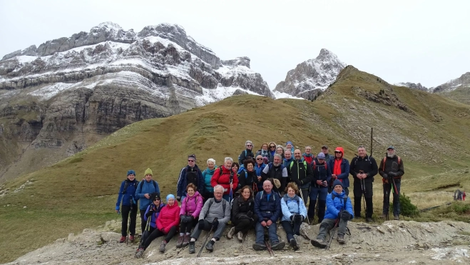 Quince minutos después de suave ascensión llegábamos al amplio Llano de Tortiellas con una estupenda visión de los Lecherines, el Aspe y el pico de la Garganta de Borau, que presentaban sus cimas adornadas por las primeras nieves otoñales, nos acercamos a contemplar el embudo que forma la enorme dolina donde se asienta el casi colmatado ibón de Tortiellas.
