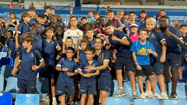 Una amplia expedición de unos 50 jóvenes del Fútbol Base Binéfar arroparon el pasado domingo en La Romareda a su vecino y amigo Andrés Borge, actual jugador del Real Zaragoza que está contando con minutos en el primer equipo a las órdenes de Fran Escribá.