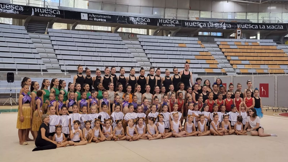 Gran domingo de gimnasia en el Palacio de los Deportes de Huesca con la exhibición de fin de temporada del Club 90. Las 100 gimnastas que ahora mismo entrenan y compiten en el club oscense han salido al tapiz para darlo todo por última vez en la temporada. Todas han estado arropadas por sus familias y amigos, expectantes en las gradas. La jornada también ha servido para recordar a la querida Inés Bergua, quien ya descuenta los días para los Juegos Olímpicos de París.