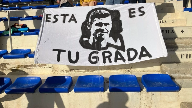 El pasado domingo, una pancarta que rezaba "Esta es tu grada" recorrió varias calles de Huesca hasta llegar hasta la Grada FSSR, la de animación, donde se sitúa Alcorazados. Fue el pequeño homenaje que la peña azulgrana quiso hacer a su entrenador.