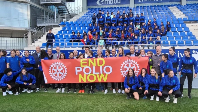 "Quiero dar las gracias a todas las que estáis aquí para que contribuyáis a erradicar la polio y deciros que vosotras, que sois emprendedoras y lucháis por un bien común,, que es ganar partidos, sois como nosotros que también queremos ganar partidos. Ganar el partido contra la polio, y que sepáis que todas lleváis un rotario dentro. Sacadlo fuera". Han sido las palabras de José Luis González, presidente del Club Rotary de Huesca, que esta tarde de martes ha obtenido el apoyo de la Sociedad Deportiva Huesca Femenino sobre el césped de El Alcoraz.