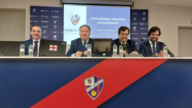 La SD Huesca ha celebrado este martes 17 de diciembre su Junta General Ordinaria de Accionistas. Lo ha hecho en la Sala de Prensa José Luis Trallero de El Alcoraz y allí han estado presentes Agustín Lasaosa, presidente del Huesca; Ricardo Mur, consejero-delegado, Alfonso García Vicente, consejero, y Antonio García Lapuente, secretario. En primer lugar, se ha recordado que el pasado dia 6 de agosto se suscribió una ampliación capital de 6.100.300 euros.