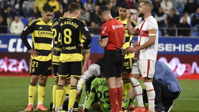 Se ha envalentonado el cuadro visitante a raíz del empate, y ha arrinconado a su rival provocando faltas laterales y córners. En uno de estos, pequeña tangana que quedaba en nada. Lo mejor que le podía pasar al Huesca es que llegara el descanso.