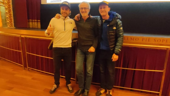 En su presentación, Lorenzo Ortas ha agradecido a los hermanos Pou el esfuerzo que habían hecho por estar en Huesca dada la cantidad de requerimientos que tienen por estas fechas. Ha recordado su anterior visita a la capital oscense y ha destacado las tres décadas que llevan “en el candelero” y la dificultad de “estar en la cresta de la ola” de forma permanente como es su caso, fruto sin duda de las hazañas que realizan. Una cordada “cohesionada”, ha observado Ortas, con alpinismo y escalada de primer nivel. “Aunque se les etiqueta más como escaladores de roca, son más alpinistas, que es la faceta que menos conocemos de ellos”. De ahí esa combinación de hielo y roca en su última incursión andina.