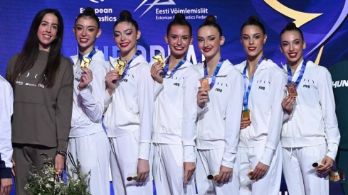 El conjunto senior de España, capitaneado por la oscense Inés Bergua, ha entrado en tromba en el Campeonato de Europa de gimnasia rítmica que se celebra en Tallin. Las españolas han logrado un pedazo de oro gracias a dos enteros perfectos en sus ejercicios con los que ha liderado la victoria en la clasificación general de forma contundente. Un título histórico puesto que hay que remontarse 33 años atrás, en 1992, cuando ganó en Stuttgart. Y este domingo, visto lo visto, puede firmar un histórico triplete en las finales por aparatos. En el podio de la general, España (53,800 puntos), se ha visto escoltada por Israel (49,500) y Hungría (48,150).