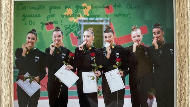 Inés Bergua también tuvo con la Federación Aragonesa un gesto de agradecimiento hacia el apoyo que le brinda constantemente y entregó otra foto enmarcada con una dedicatoria similar a la que hizo con el Club 90 y en este caso destinada “a toda la rítmica aragonesa”.