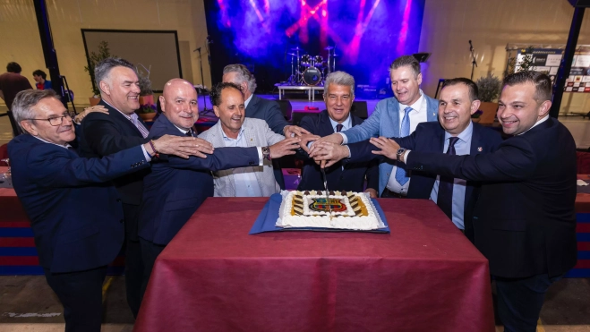 Este pasado viernes tuvo lugar la cena de celebración del 50 aniversario de la Peña Barcelonista de Fraga y Comarca Jaume Pallarés, con la presencia del presidente del FC Barcelona, Joan Laporta. También asistieron el directivo responsable del Área Social, Josep Ignasi Macià, el vocal de la Junta Directiva Sisco Pujol, el miembro de la Comisión Social del Club Lluís Pérez y el ex jugador y miembro de la Agrupación Barça Jugadors Paco Martínez.