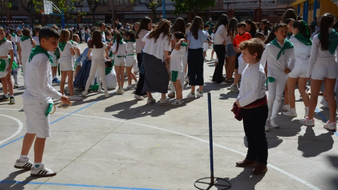 Celebrando la XLIV Semana Cultural Aragonesa en el Colegio "San Viator" de Huesca y dentro de su programación, en el patio de recreo se realizaron juegos tradicionales aragoneses, rana, hoyetes, anillas verticales, siete y medio, palistroc, bolinches, anillas, aros, tiro al palo…, dirigidos por los monitores de Huesca Fernando y Mariano Carrera.