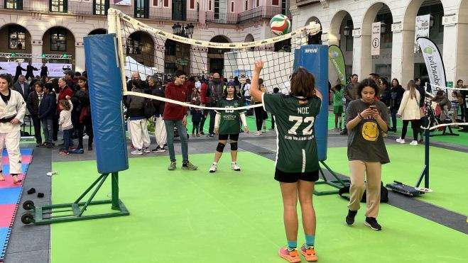 Una plaza Luis López Allué hasta la bandera con un ambientazo fabuloso ha acogido este sábado por la tarde la inauguración oficial del Tour Universo Mujer en Huesca. Cientos de niños y niñas se han dado cita en un recinto polideportivo al aire libre de unos 2.000 metros cuadrados donde han tenido más de una veintena de deportes. Una oportunidad inmejorable de adentrarse en la actividad física, con una enorme variedad a disposición de todos los gustos: balonmano, nanbudo, tenis, rugby, halterofilia, judo, esgrima, buceo, tenis, gimnasia, curling, etc.