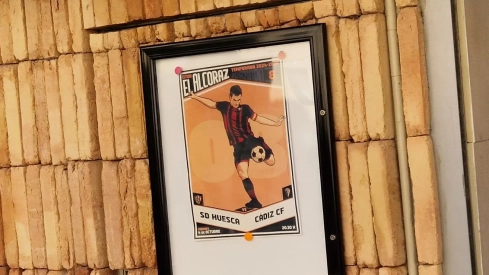 El sempiterno capitán de la historia de la Sociedad Deportiva Huesca Juanjo Camacho es la imagen icónica de los carteles del Huesca-Cádiz que se disputa esta tarde, a las 20:30 horas, en El Alcoraz.
