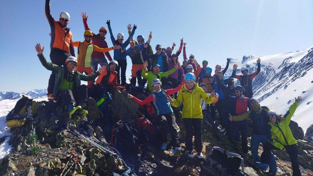 Con todos estos aprendizajes, se llega al muro de roca esquistosa que da pie a la cima, donde se dejan los esquís para trepar unos pocos metros de desnivel. La loma de la cima de 2.716 metros de altitud está pelada de nieve, y así se acomoda el grupo para las divertidas fotos de cumbre que se ha llenado de esquiadores como ven por sorpresa una pareja de franceses que acaba de llegar.