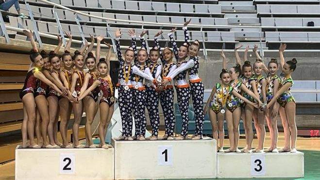 La relación de medallistas la completa el conjunto cadete Autonómico formado por Irene García Muniesa, Itziar Frontons, Clara Brusau, Daniela Hinestrosa, María Pueyo, Noa Ballabriga y Natalia Porta, bronce con su montaje de diez mazas.