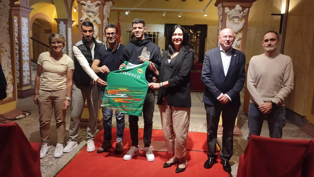 Sedjati ha mostrado la medalla de plata del reciente Mundial de Tokio y ha sido obsequiado con el detalle de la fachada del Ayuntamiento y el concejal de Deportes, Leopoldo Carranza, le ha puesto la pañoleta, símbolo de la fiesta oscense, para posar todos en familia y con la camiseta de Intec-Zoiti que lucirá la próxima temporada.