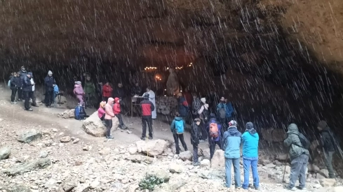 El mal tiempo ha acompañado este año al Belén de Peña Guara en las Gorgas de San Julián de Lierta. Nieve por el camino, sin llegar a cuajar, humedad y frío. Entre eso y la niebla que asomaba en Huesca, muchos de los habituales en esta cita del día de Navidad que este jueves celebraba 53 años de vida, se han ausentado.