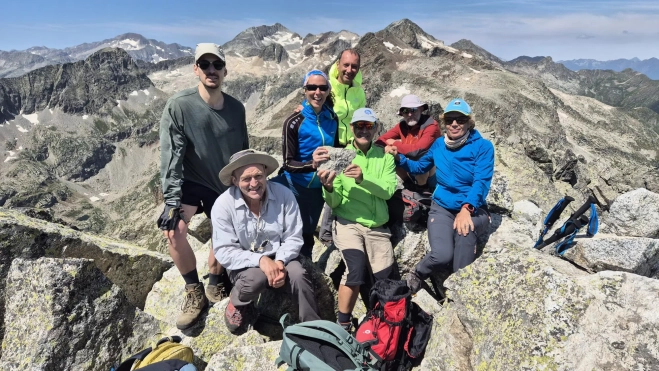 En unas 2 horas y media se salvan los cerca de 1.100 metros de desnivel que hay hasta los 2.842 metros de la cima rocosa, que presenta una bonita cresta cuarteada por la que se transita sin dificultad, en el inclinado trayecto que permite recorrerlo en poco tiempo. Unos largos minutos de descanso y observación de ambas vertientes en la cumbre permiten deleitarse con una de las mejores vistas de los valles de Benasque y de Luchon, con la vista de todo el macizo de las Maladetas con los restos de su glaciar, el pico de Alba y las crestas que delimitan esas cumbres recorridas, como la de Maladeta que se ascendió el año pasado en una jornada que nada tiene que ver con la de este sábado, cálida y algo ventosa en las cimas.