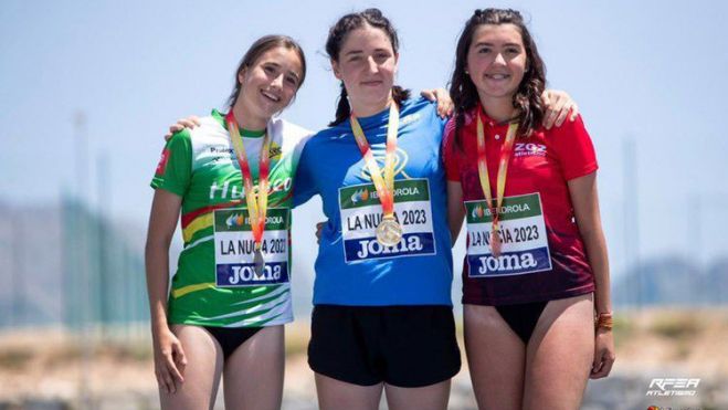 Una medalla inesperada, sí. Pero no tan sorprendente. Venía de antemano el aviso de que Laguarta estaba en clara línea ascendente con marcas que le habían llevado desde los 33 hasta los 39 metros que le abrieron de par en par las puertas del Nacional. El objetivo era pasar a la mejora y disponer de tres tiros adicionales. Hizo un lanzamiento de 39 y con el 40.25 del tercero ya iba al frente de la clasificación. En el cuarto intento se fue hasta los 42.39 metros y allí se vio que era medalla. Sus dos rivales directas eran también aragonesa, la ganadora del Alas y el bronce Noa Esteban, del filial zoitista Zaragoza Atletismo, que acabó con 42.19. Las tres estuvieron separadas por centímetros. María, tanto en el regional como el nacional, siempre ha estado en medio de ambas. Y así ha quedad.