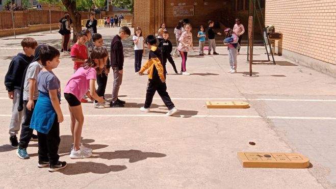 Más de medio millar de jóvenes participaron en la semana cultural del Colegio Público Sancho Ramírez donde, entre otros actos, se celebraron los juegos tradicionales aragoneses dirigidos por los monitores de Huesca Fernando y Mariano Carrera Martín con la colaboración del profesorado del centro.