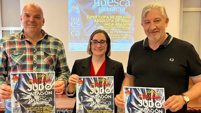 El concejal de Deportes, Keko Cajal; la presidenta de la Federación Aragonesa de Judo, Cristina Berrocal; y el director de la Escuela Federativa Nacional de la Real Federación Española de Judo y deportes asociados, José Ángel Hierro, han presentado la competición en el Ayuntamiento de Jaca.