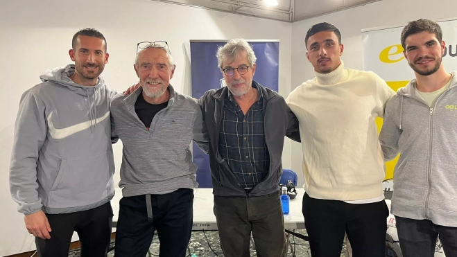 La Sala de Exposiciones del Ayuntamiento de Ayerbe "Adelina Jiménez" ha acogido este miércoles el segundo encuentro 'Somos ProvincIA', un encuentro con deportistas impulsado por la SD Huesca y la Fundación Alcoraz. Los jugadores de la SD Huesca Óscar Sielva e Ignasi Vilarrasa, los alpinistas Antonio Ubieto e Ignacio Cinto, y el 'biker' Gabriel Torralba han sido los protagonistas de un encuentro distendido moderado por el periodista Pablo Barrantes; una charla que ha tocado múltiples temas como la psicología, la dificultad de la montaña, la expedición altoaragonesa al Everest o el mundo de las bicicletas eléctricas.