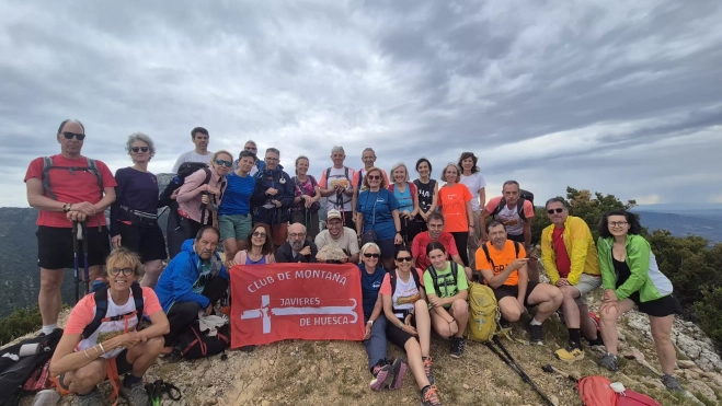 Cual si fuera un compás, Javier Cruchaga, presidente del Club de Montaña Javieres, empezó a girar sobre las vistas casi infinitas desde el Pico de Montidiñera (o Montidinero o Montidinera, que tiene tres nombres) y a explicar lugares que ya han hollado: Guara, Fragineta, Fraga, el Moncayo o la propia capital, traslúcidos por la niebla presente.