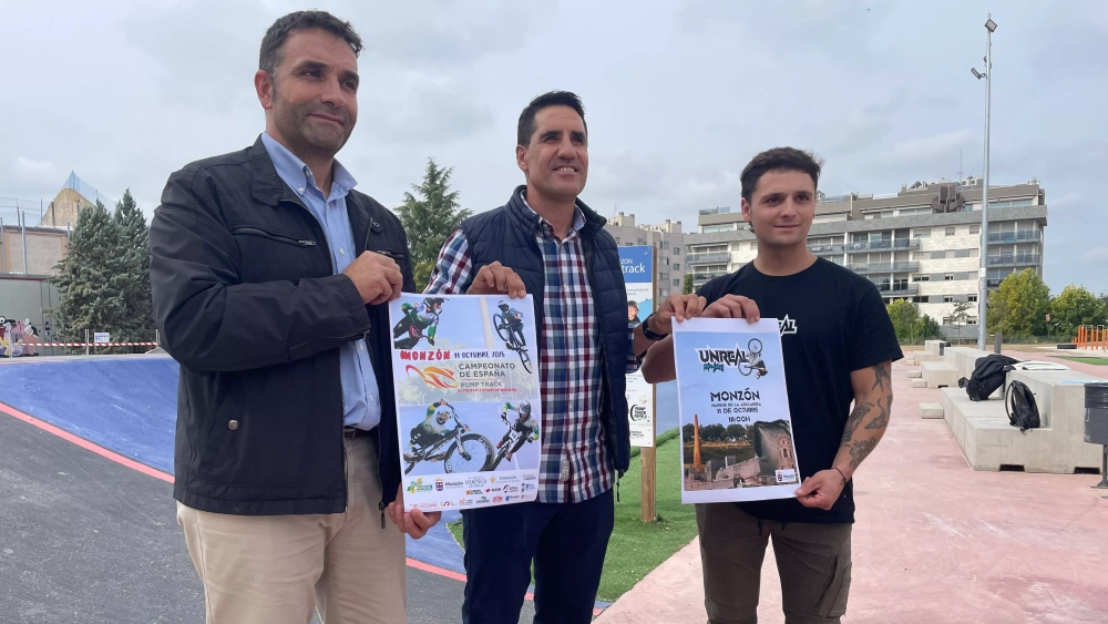 El concejal de Deportes del Ayuntamiento de Monzón, Eliseo Martín, el presidente del club Sport Biofrutal, Marcos Barranco, y el responsable de Unreal Bike Show, Ignasi Pascual, han presentado este viernes en la pista del Parque de la Azucarera el Campeonato de España de Pump Track individual “Ciudad de Monzón”, que se celebrará el día 11 de octubre, a partir de las 11:00h, con unos 200 participantes.