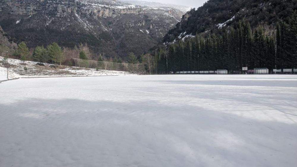 En Lafortunada juega la Unificación del Alto Cinca. El Santandreu, campo de fútbol donde juega el equipo del pueblo sus partidos en Segunda Regional, está completamente nevado. Este domingo recibe al CD Belver para disputar la decimosexta jornada de liga, pero la situación "no pinta muy bien", según afirman desde el club sobrarbense. Además, "dan frío y eso no ayuda mucho".