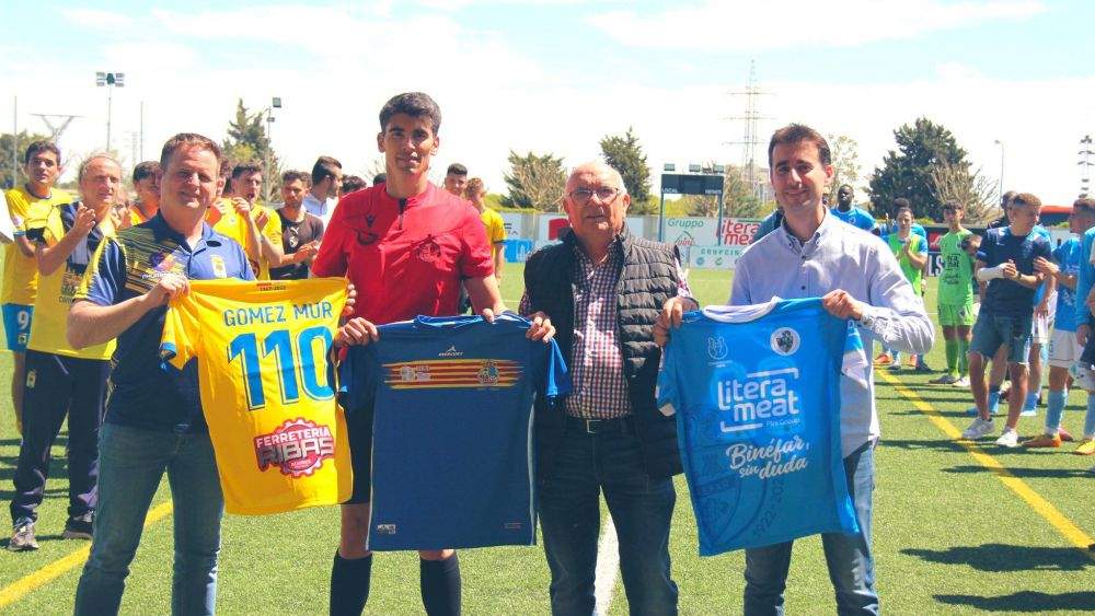 José Manuel Murillo, delegado del Binéfar; Jesús Bolea, delegado del Robres y Paco Fuentes, miembro de la junta directiva de la Real Fefederación Aragonesa de Fútbol le entregaron unas camisetas de cada equipo a modo de homenaje.