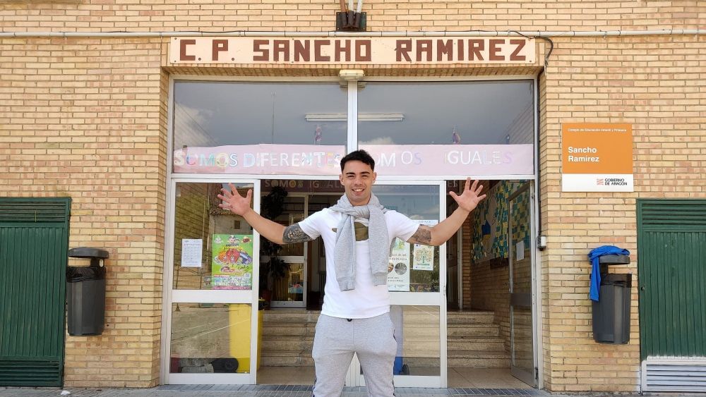 Estudió en el Colegio Sancho Ramirez desde Infantil hasta que pasó al instituto. El futbolista oscense aportó fotografías que se expusieron en un proyector, de su época en el Colegio Sancho Ramirez de la ciudad y que evidenciaban los cambios tecnológicos y sociales de las últimas décadas.