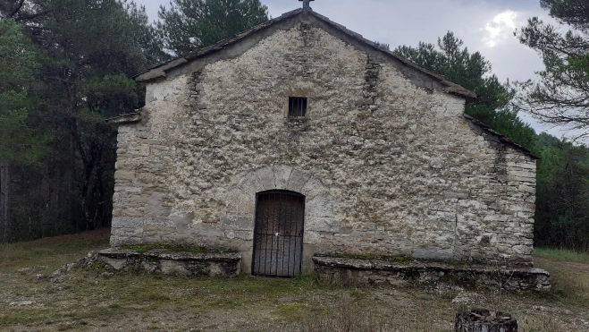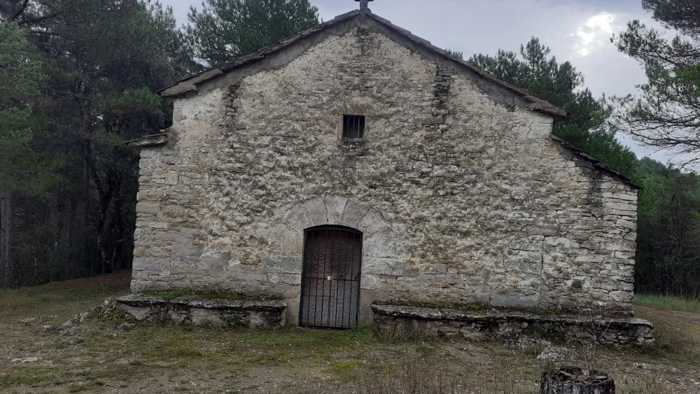 Así pues, tras un tramo bastante pendiente llegamos hasta la ermita de la Virgen del Monte (706 m.), que haciendo gala a su nombre, está rodeada del mismo bosque de pinos, carrascas, chinebros, buchos y romeros que todo el día nos acompaña, pero si cabe aún más tupido, un sitio delicioso al que de romería se llegan, cada 25 de marzo, las gentes de Escanilla y Lamata un año cada pueblo.