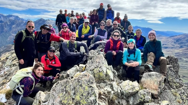 La subida al Peyreget es sencilla, superando solo 150m. de desnivel. Podemos ver al grupo de adultos en la cima lo que nos anima a hollar la cima. La panorámica es estupenda, alcanza varias líneas de cumbres en todas las direcciones. Pero es el Midi d´Oseau el que atrapa la mirada como un imán, con su porte orgulloso que se eleva por encima de todas las demás cimas cercanas.