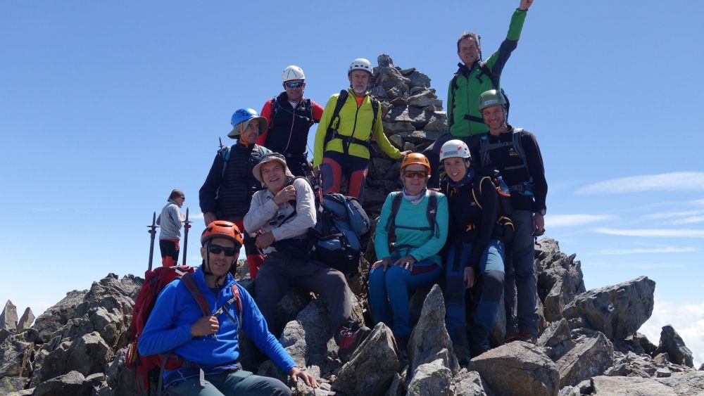 Después del mediodía se alcanza la cumbre del Pic Badet, donde un simpático francés que viene haciendo un largo trayecto ascendiendo por los restos del nevero del antiguo glaciar nos hace unas fotos de grupo para dejar constancia de esta aproximación a la cresta del Pic Long que se observa desde esta cima, como un ambicioso objetivo.