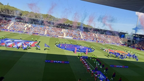 Un sector de los aficionados blaugranas, que eran mayoría en el estadio respecto a los colchoneros, ha silbado el himno de España poco antes de empezar el partido.
